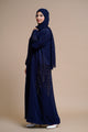 This abaya is an elegant and sophisticated addition to any wardrobe. The delicate hand-stitched embellishments add a touch of elegance and glamour to this luxurious piece. Feel confident and stylish in this exquisite abaya. The abaya features pop-up buttons on the front, allowing it to be worn open or closed.