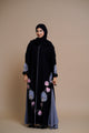 Premium luxury floral detailed black open abaya with gray chiffon panels.